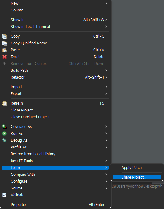 프로젝트 우클릭 -> Team -> Share Project
